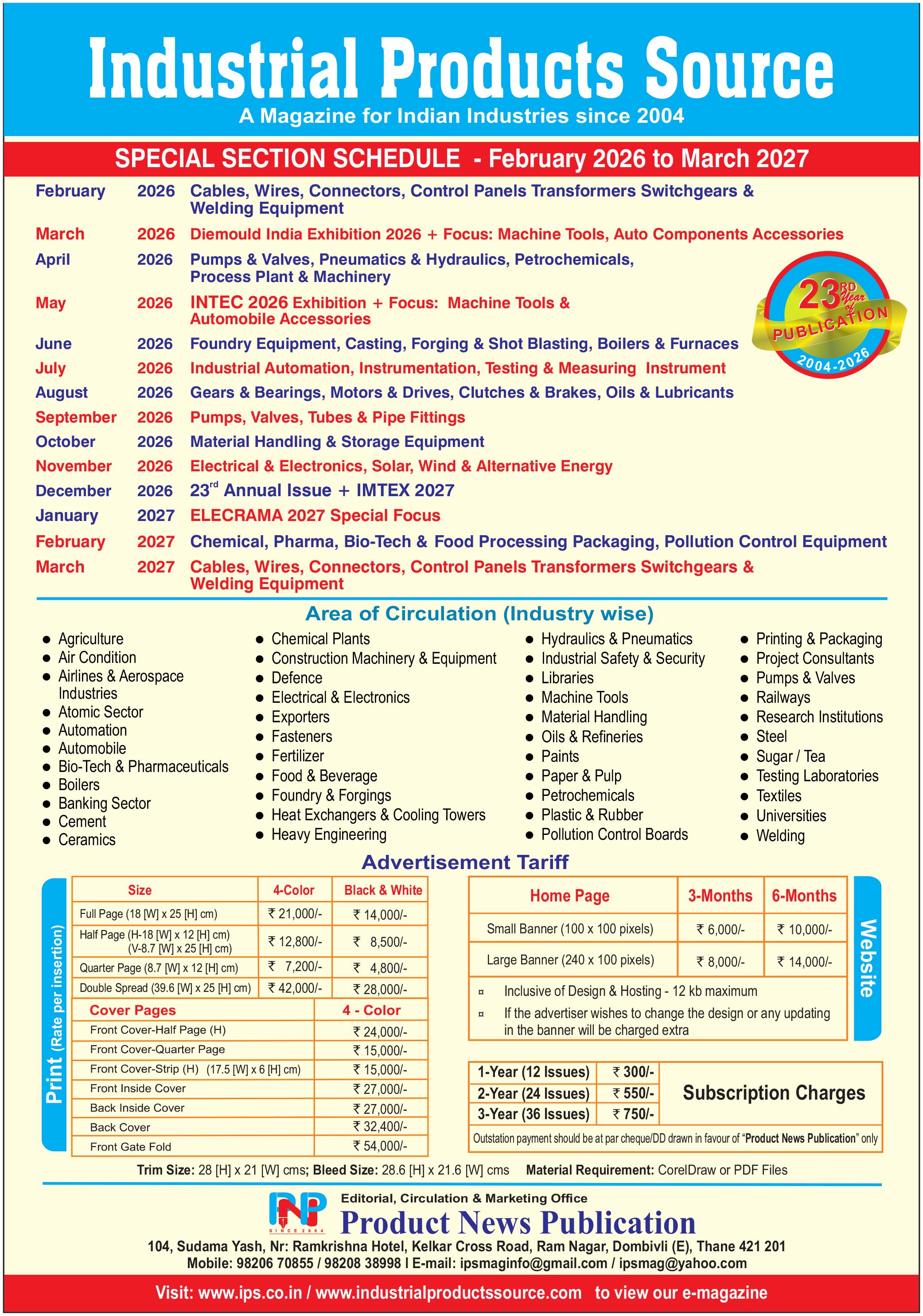 Industrial Products Source is an industrial products / processes / services review monthly published from Mumbai, India by a team of professionals having more than two decades of experience in trade magazines. It also carries technical articles written by professionals, industrial exhibitions, company profiles, company news and events. The spectrum of contents encompasses every field of industry.